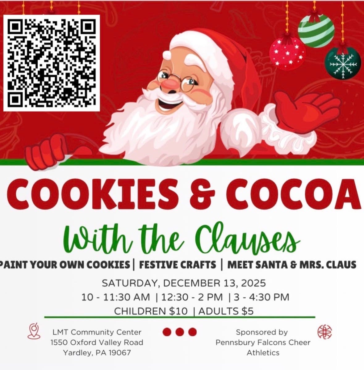 10am (& 12:30pm, 3pm): Pennsbury Falcon Cheer Athletics, Cookies and Cocoa with the Clauses (LMT Community Center) - See flyer below