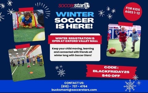 Use code “BLACKFRIDAY25” to save $40 off the winter session at the Oxford Valley Mall! For more details, please visit: www.soccerstars.com/pa/bucksmont/