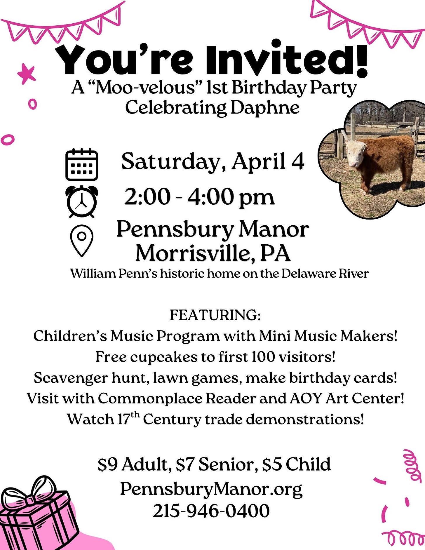 2:00pm: Pennsbury Manor, 1st Birthday Party for the cow, Daphne (Flyer below)